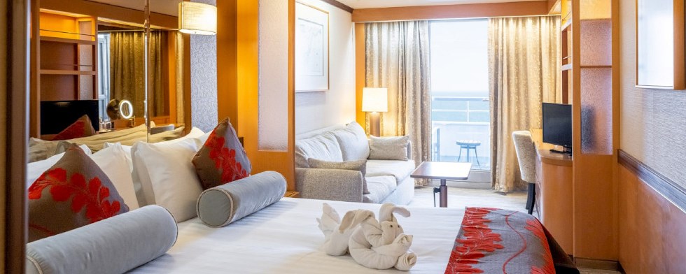 Superficie de la suite : 36 m² | Superficie du balcon : 18 m² - Offrant un vaste espace de vie, les Suites Renaissance sont situées sur le Pont 10 Marquises et disposent de deux lits bas convertibles en grand lit Queen Size, d’un grand espace salon avec canapé convertible en grand lit, d’un espace garde-robe, d’une salle de bains avec baignoire à remous. Sa terrasse est équipée de fauteuils de relaxation et d’une table où vous pourrez aisément prendre votre petit-déjeuner ou votre dîner. Les Suites ont également un accès au Club Concierge situé sur le Pont 10 et aux services exclusifs d'un concierge dédié.