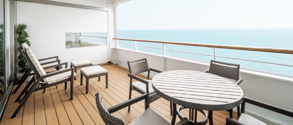 Superficie : 20 m² + balcon privé de 5m² La cabine dispose de : Deux lits bas, convertibles en grand lit - Sanitaires privés avec baignoire - Service de cabine dédié, deux fois par jour - Télévision avec chaînes françaises (selon réception satellitaire), films en français et chaîne d’information sur la navigation - Téléphone à accès direct - Coffre-fort individuel - Mini Bar - Sèche-cheveux - Climatisation à réglage individuel - Prises électriques 110/220 AC | Serviette de piscine et couverture de pont mises à disposition gratuitement - Peignoir à disposition pendant la croisière - Espace de rangement - Service de petit-déjeuner continental en cabine gratuit - Menu de service en cabine disponible de 10h à minuit - Service de blanchisserie et de repassage. Certains services font l’objet d’un supplément. Veuillez nous consulter.