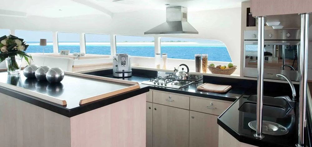 -Les espaces communs intérieurs : Un carré offrant un magnifique panorama mer sur 270°/ Cuisine professionnelle dans le carré, fours, table de cuisson, lave-vaisselle, 2 réfrigérateurs, 1 congélateur + 2 en soutes, machine à café… /Wifi central (uniquement dans les zones où le signal est accessible).