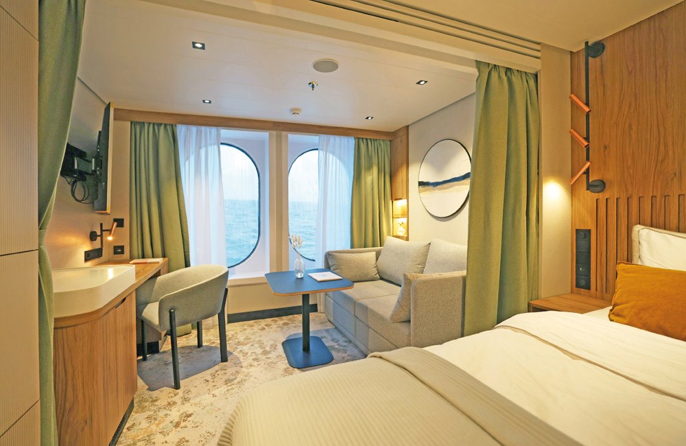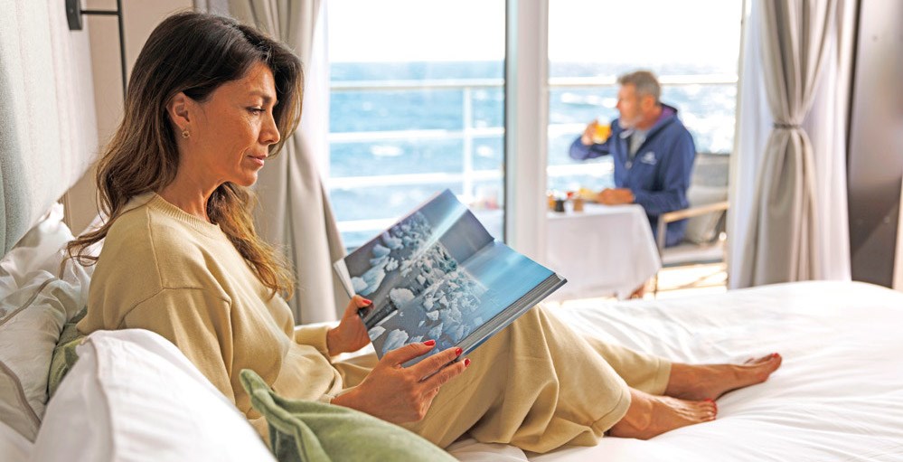 Chacune des 96 cabines ou suites est spacieuse, dotée d’une vue mer panoramique et pour la majorité d’un balcon. Cheminée, œuvres d’art, écran plat, confortables canapés : tout a été conçu dans les moindres détails pour créer un univers cosy et design digne d’un 5*.
