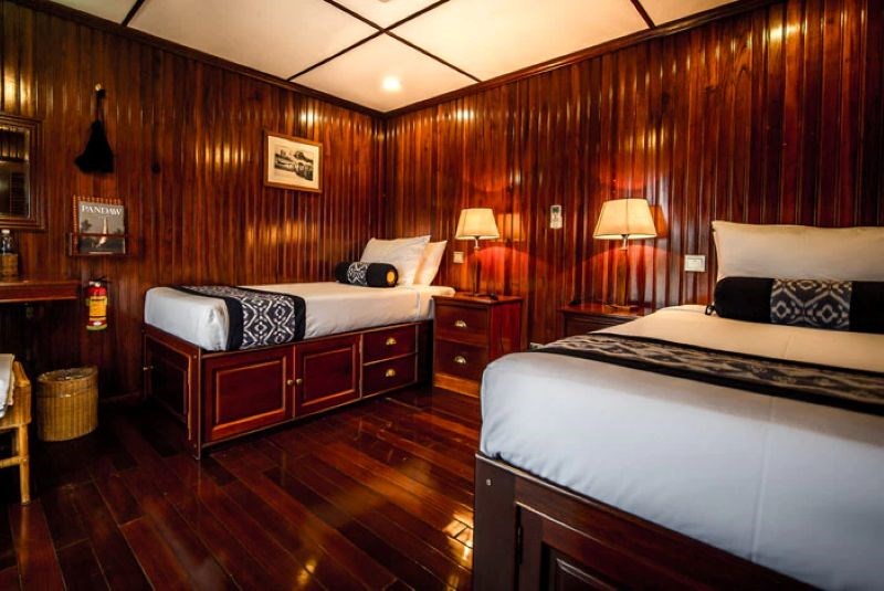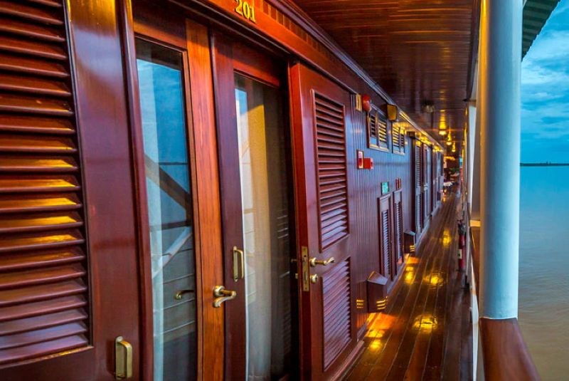 Le R/V Angkor Pandaw dispose de 10 cabines sur le pont Principal et de 6 cabines sur le pont Supérieur, toutes de 15 m². Parées de bois exotique, toutes les cabines sont équipées de lits simples ou doubles, d’une penderie, d’une salle d’eau avec toilettes, d’un sèche-cheveux et d’un mini-coffre.