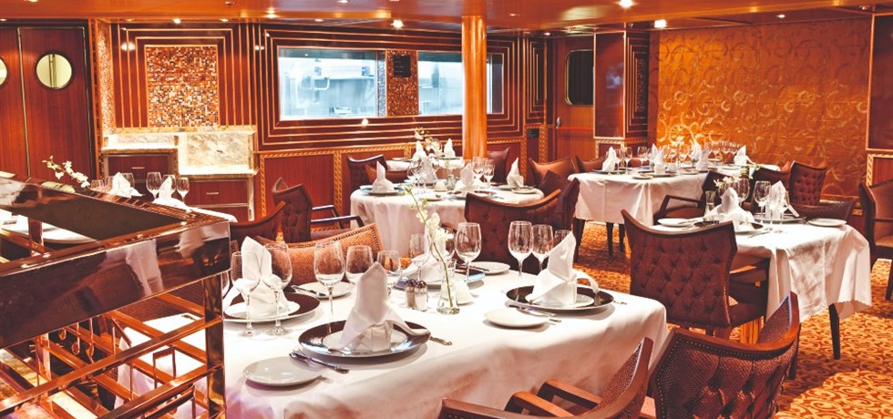 Pension complète : petit déjeuner (service en cabine payant), déjeuner, dîner et snack