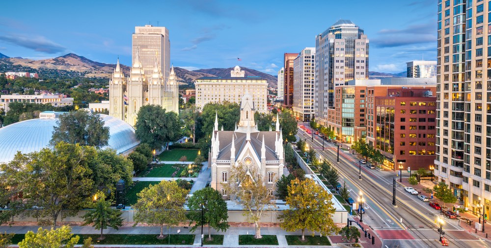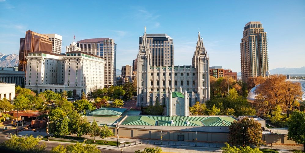 Adossée aux montagnes, Salt Lake City regarde le grand Lac Salé. Avec ses maisons qui grimpent à l'assaut des premiers champs de neige, la capitale de l'Utah est une ville étonnamment calme. Les gazons bien peignés, les rues bordées de pruniers et de peupliers se vident le dimanche. Ce jour-là, les Mormons le passent en famille. La ville, fondée en 1847 par Brigham Young, est le centre religieux de l'Eglise de Jésus-Christ des Saints des Derniers Jours.