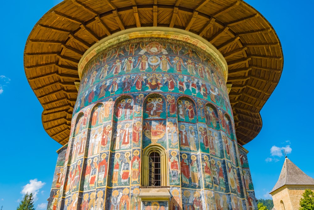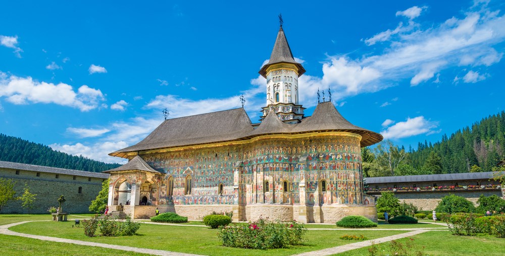 Petit-déjeuner à l’hôtel. Départ pour la Bucovine la région des monastères peints. Arrêt au monastère d’Agapia, le plus grand complexe monastique de Roumanie. Les fresques intérieures ont été réalisées par Nicolae Grigorescu quelques années avant son départ vers Barbizon afin d’y rencontrer les précurseurs du réalisme français dont Jean-François Millet. Puis, détour par Tarpesti et visite de la maison de Nicolae Popa, créateur populaire de masques traditionnels, un des noms de référence dans l’art naïf roumain. Déjeuner dans un restaurant local en cours de visite. Arrivée en Bucovine, berceau d'une vieille civilisation où l'histoire est liée aux légendes, et célèbre grâce à ses monastères aux fresques extérieures (UNESCO), notamment ceux de Voronet, Arbore, Humor, Moldovita, Sucevita, Putna et Dragomirna. Les fresques représentent des scènes bibliques et religieuses. Visite du monastère de VORONET, le plus célèbre d’entre tous surnommé la « Chapelle Sixtine de l’Orient ». Sur son mur occidental, on peut y admirer une fresque du « Jugement dernier » réalisée en 1547 sur un fond de couleur bleue tout à fait originale. Visite du monastère de MOLDOVITA, aux fresques dorés et bleus représentent le “Siège de Constantinople” et “l’Arbre de Jessée”. Route vers un village typique blotti au cœur de la Bucovine. Rencontre avec les habitants afin de partager sur leur vie quotidienne et leurs coutumes. Dîner de plats traditionnels et dégustation de l’eau-de-vie locale, l’afinata. Installation dans une pension de famille pour la nuit.