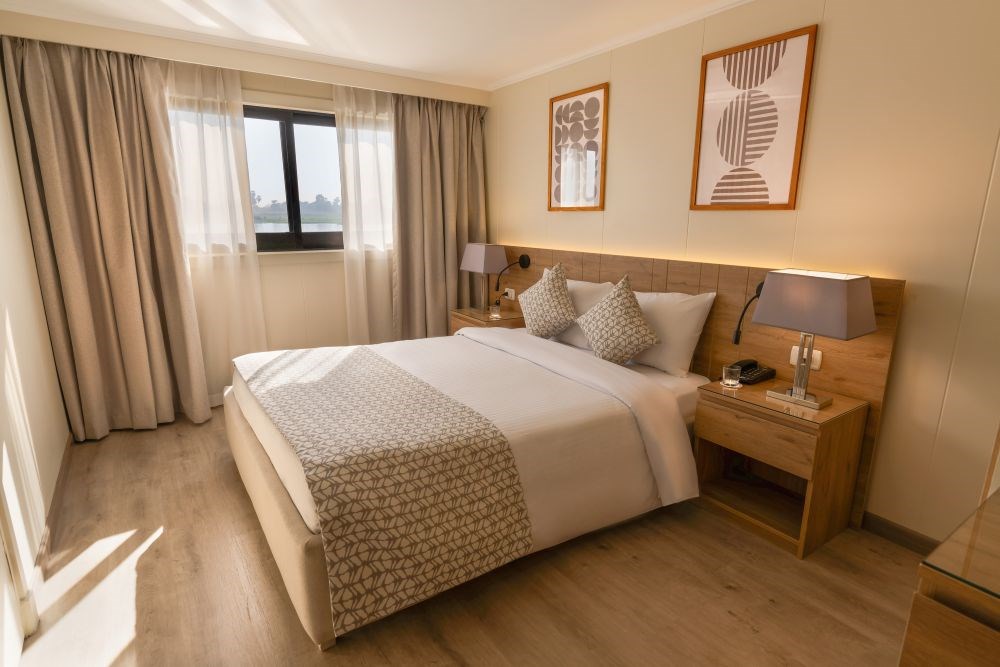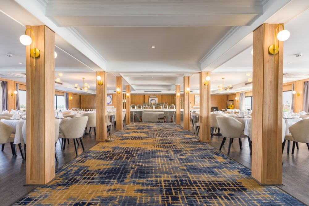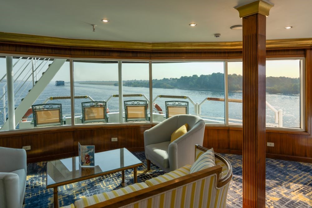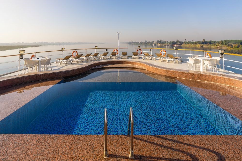 VOTRE BATEAU : Le RV Star of Luxor 5 ancres, ou similaire, est un bateau à dimension humaine, mesurant 72 m de long et 13,60 m de large. Il peut accueillir 106 passagers, dans 53 cabines disposées sur trois ponts. Chacune des cabines, d’une superficie de 14.5² à 16m² (auxquelles s’ajoutent deux suites de 22 m2 chacune), dispose de toutes les commodités et offre les meilleures conditions de séjour. La décoration est soignée et son atmosphère, à la fois élégante et conviviale, est en parfait accord avec son environnement. Depuis le salon / bar et la bibliothèque, de larges baies vitrées permettent d’admirer les splendides paysages traversés. Le pont soleil, lieu idéal pour se relaxer et admirer les paysages, dispose d’un solarium équipé de transats, ainsi qu’une petite piscine et un jacuzzi.