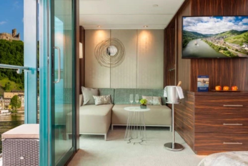 Les cabines situées sur le pont inférieur disposent de grandes fenêtres panoramiques fixes. Celles des ponts intermédiaire et supérieur sont dotées de fenêtres panoramiques ouvrables, tandis que les Junior Suites, plus spacieuses, offrent un coin salon et un balcon privé.