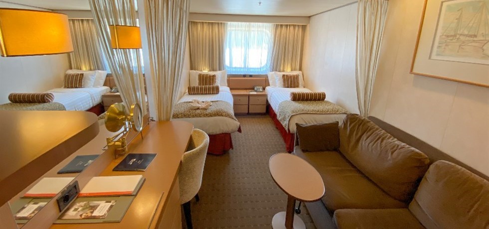 Superficie : 17 m² - La cabine dispose de : Deux lits bas, convertibles en grand lit - Sanitaires privés avec baignoire - hublots - Service de cabine dédié, deux fois par jour - Télévision avec chaînes françaises (selon réception satellitaire), films en français et chaîne d’information sur la navigation - Téléphone à accès direct - Coffre-fort individuel - Mini Bar - Sèche-cheveux - Climatisation à réglage individuel - Prises électriques 110/220 AC | Serviette de piscine et couverture de pont mises à disposition gratuitement - Peignoir à disposition pendant la croisière - Espace de rangement - Service de petit-déjeuner continental en cabine gratuit - Menu de service en cabine disponible de 10h à minuit - Service de blanchisserie et de repassage. Certains services font l’objet d’un supplément. Veuillez nous consulter.
