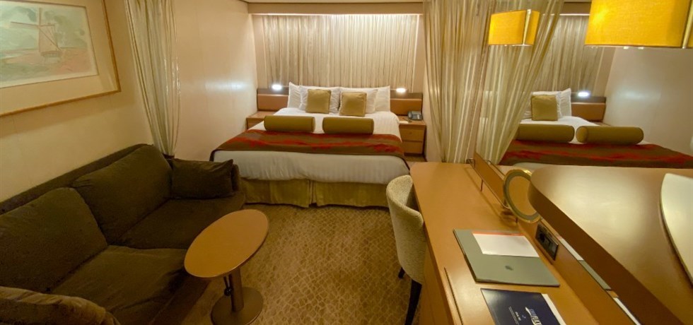 Superficie de la suite : 36 m² | Superficie du balcon : 18 m² - Offrant un vaste espace de vie, les Suites Renaissance sont situées sur le Pont 10 Marquises et disposent de deux lits bas convertibles en grand lit Queen Size, d’un grand espace salon avec canapé convertible en grand lit, d’un espace garde-robe, d’une salle de bains avec baignoire à remous. Sa terrasse est équipée de fauteuils de relaxation et d’une table où vous pourrez aisément prendre votre petit-déjeuner ou votre dîner. Les Suites ont également un accès au Club Concierge situé sur le Pont 10 et aux services exclusifs d'un concierge dédié.