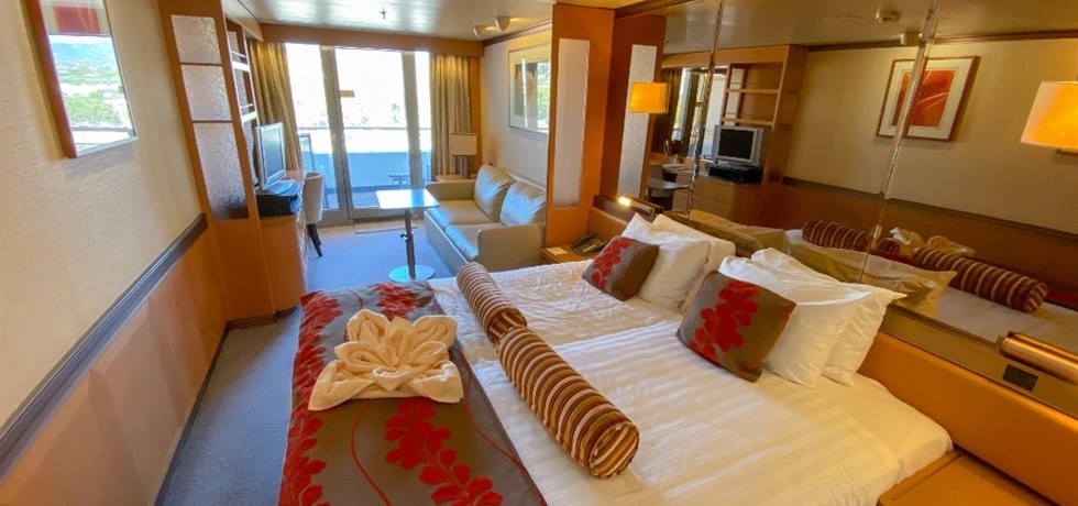 Superficie : 20 m² + balcon privé de 5m² La cabine dispose de : Deux lits bas, convertibles en grand lit - Sanitaires privés avec baignoire - Service de cabine dédié, deux fois par jour - Télévision avec chaînes françaises (selon réception satellitaire), films en français et chaîne d’information sur la navigation - Téléphone à accès direct - Coffre-fort individuel - Mini Bar - Sèche-cheveux - Climatisation à réglage individuel - Prises électriques 110/220 AC | Serviette de piscine et couverture de pont mises à disposition gratuitement - Peignoir à disposition pendant la croisière - Espace de rangement - Service de petit-déjeuner continental en cabine gratuit - Menu de service en cabine disponible de 10h à minuit - Service de blanchisserie et de repassage. Certains services font l’objet d’un supplément. Veuillez nous consulter.