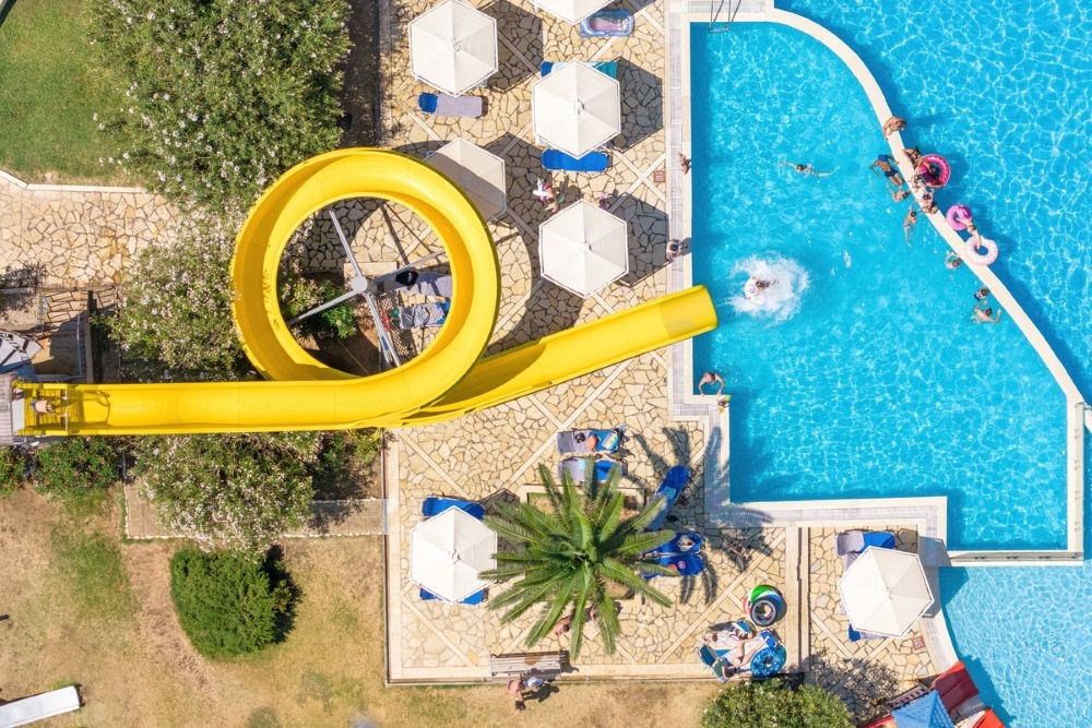1 piscine principale d'eau de mer avec toboggans, transats et parasols gratuits.