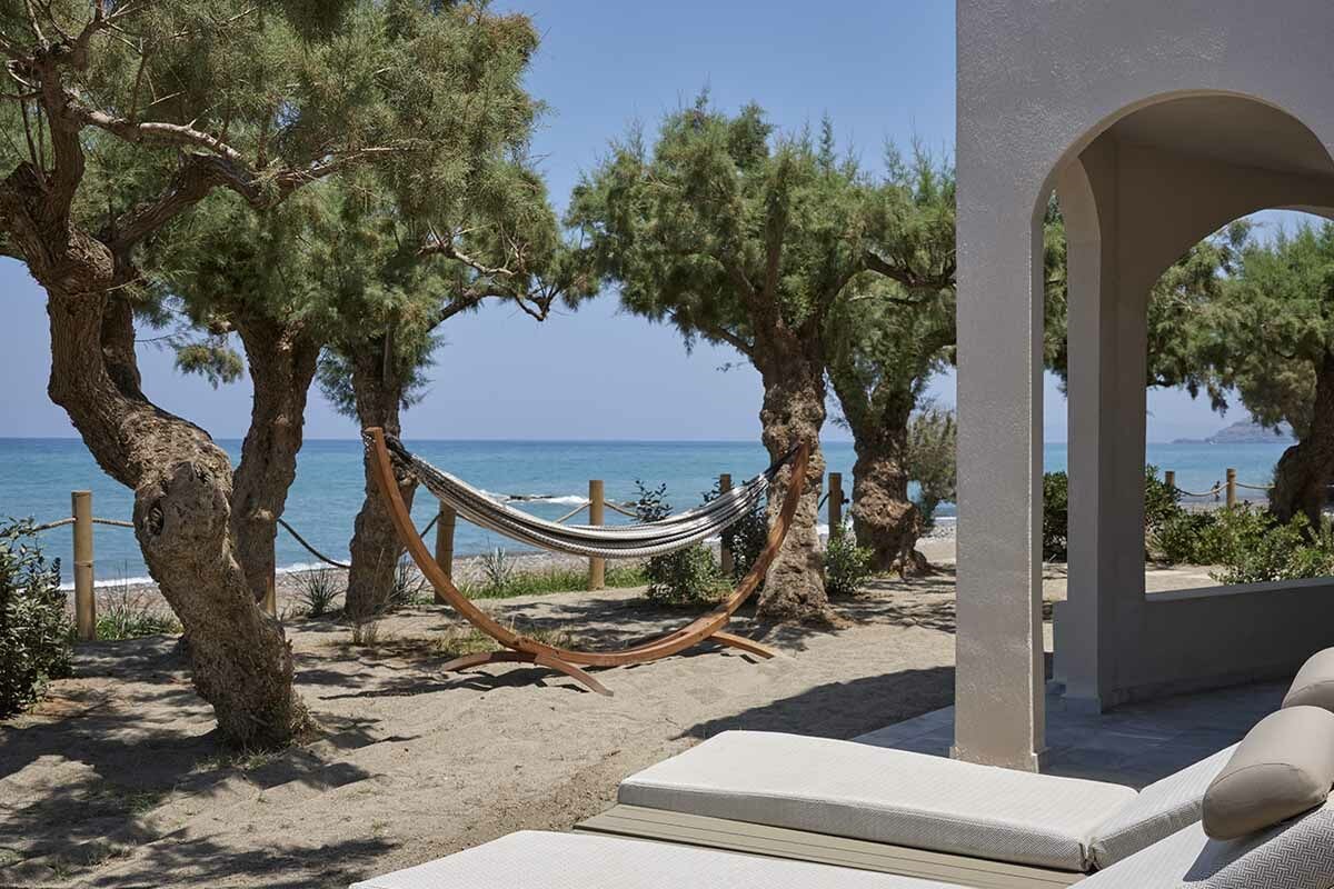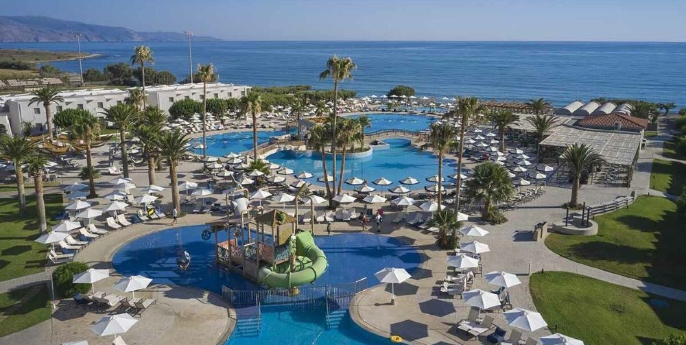 L’hôtel offre 140 chambres au cœur de beaux jardins, réparties en 5 bâtiments de 1 à 3 étages formant un petit village crétois aux façades blanches mêlées de pierres.