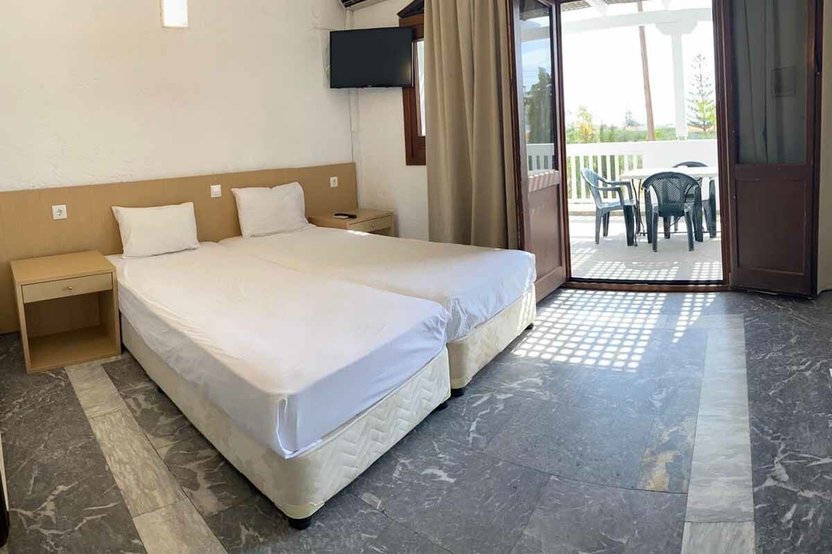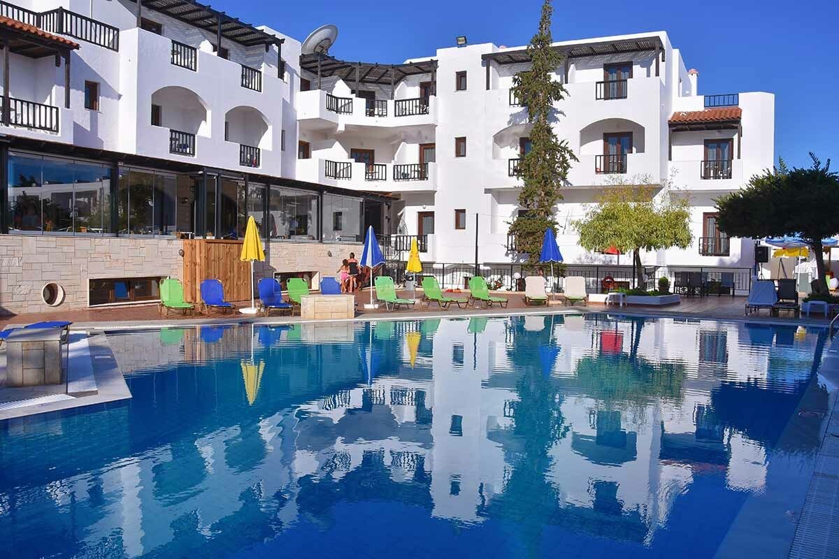 L’hôtel offre 140 chambres au cœur de beaux jardins, réparties en 5 bâtiments de 1 à 3 étages formant un petit village crétois aux façades blanches mêlées de pierres.