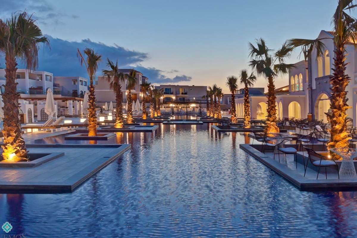 Situé à 100 m d’une longue plage de sable (“Pavillon bleu”, accès par un passage souterrain), 3 km de Georgioupolis, 19 km de Réthymnon, 36 km de La Chanée et 105 km de l’aéroport d’Héraklion.
