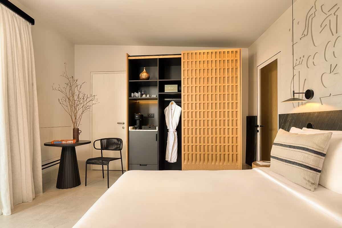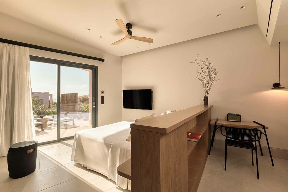 L'hôtel offre 50 suites et 2 villas exclusives, toutes dotées de piscines privées et offrant des vues imprenables sur la mer Égée et les couchers de soleil emblématiques de l'île. L'architecture moderne s'inspire des Cyclades, avec des matériaux locaux tels que la pierre volcanique et le chêne blond.