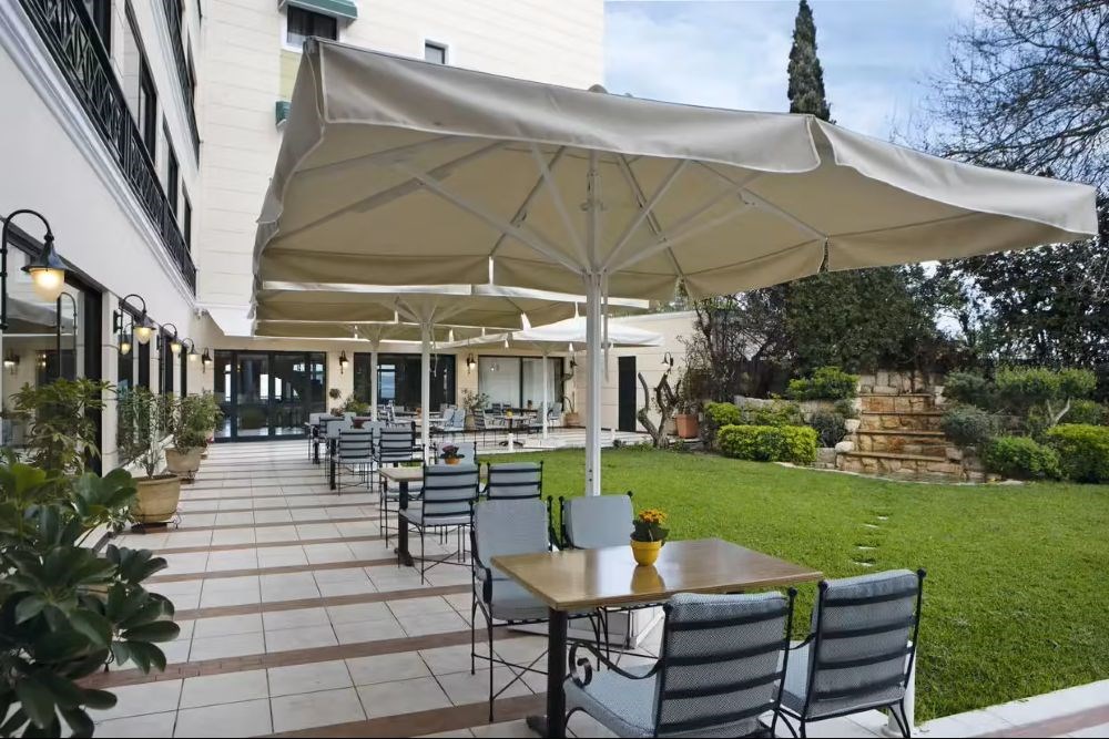 - Restaurant à la carte (situé dans le jardin), ouvert de 18h à 22h : propose une cuisine grecque et internationale. Sur réservation.